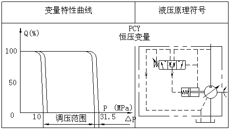 這種變量型式的泵,輸出壓力小于調(diào)定恒壓力時(shí),全排量輸出壓力油,即定量輸出,在輸出油液的壓力達(dá)到調(diào)定壓力時(shí),就自動(dòng)地調(diào)節(jié)泵流量,以保證恒壓力,滿(mǎn)足系統(tǒng)的要求。泵的輸出恒壓值,根據(jù)需要,在調(diào)壓范圍內(nèi)可以無(wú)級(jí)調(diào)定,泵的結(jié)構(gòu)見(jiàn)圖6,該結(jié)構(gòu)將輸出的壓力油同時(shí)通至變量活塞下腔和和恒壓閥的控制油入口,當(dāng)輸出壓力小于調(diào)定恒壓力時(shí),作用在恒壓閥芯上的油壓推力小于調(diào)定彈簧力,恒壓閥處于開(kāi)啟狀態(tài),壓力油進(jìn)入變量活塞上腔,變量活塞壓在最低位置,泵全排量輸出壓力油; 當(dāng)泵在調(diào)定恒壓力工作時(shí),作用在恒壓閥芯上的油壓推力等于調(diào)定彈簧力,恒壓閥的進(jìn)排油口同時(shí)處于開(kāi)啟狀態(tài),使變量活塞上下腔的油壓推力相等,變量活塞平衡在某一位置工作,若液壓阻尼(負(fù)載)加大,油壓瞬時(shí)升高,恒壓閥排油口開(kāi)大、進(jìn)油口關(guān)小,變量活塞上腔比較下腔壓力降低、變量活塞向上移動(dòng),泵的流量減小,直至壓力下降到調(diào)定恒壓力,這時(shí)變量活塞在新的平衡位置工作。反之,若液壓阻尼(負(fù)載)減小,油壓瞬時(shí)下降,恒壓閥進(jìn)油口開(kāi)大,排油口關(guān)小,變量活塞上腔比較下腔油壓升高,變量活塞向下移動(dòng),泵的流量增大,直至壓力上升至調(diào)定恒壓力。
