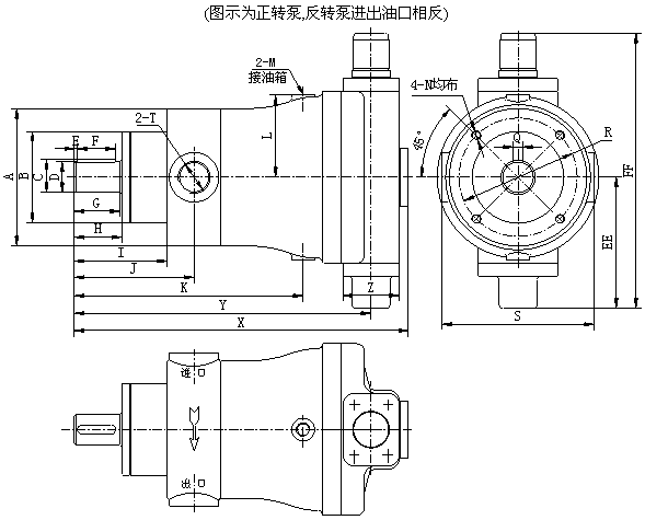 主體部分(參見(jiàn)結(jié)構(gòu)剖)由傳動(dòng)軸帶動(dòng)缸體旋轉(zhuǎn),使均勻分布在缸體上的七個(gè)柱塞繞傳動(dòng)軸中心線(xiàn)轉(zhuǎn)動(dòng),通過(guò)中心彈簧將柱滑組件中的滑靴壓在變量頭(或斜盤(pán))上。這樣,柱塞隨著缸體的旋轉(zhuǎn)而作往復(fù)運(yùn)動(dòng),完成吸油和壓油動(dòng)作。