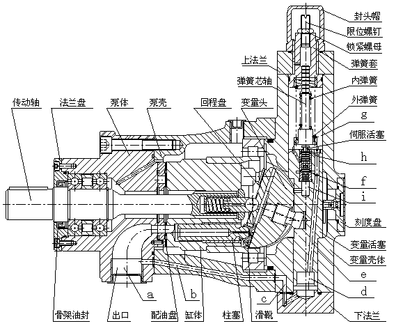壓力補(bǔ)償變量泵的出口流量隨出口壓力的大小近似地在一定范圍內(nèi)按恒功率曲線變化。當(dāng)來自主體部分的高壓油通過通道(a)、(b)、©進(jìn)入變量殼體下腔(d)后,油液經(jīng)通道(e)分別進(jìn)入通道(f)和(h),當(dāng)彈簧的作用力大于由油道(f)進(jìn)入伺服活塞下端環(huán)形面積上的液壓推力時(shí),則油液經(jīng)(h)到上腔(g),推動(dòng)變量活塞向下運(yùn)動(dòng),使泵的流量增加。當(dāng)作用于伺服活塞下端環(huán)形面積上的液壓推力大于彈簧的作用力時(shí),則伺服活塞向上運(yùn)動(dòng),堵塞通道(h),使(g)腔的油通過(i)腔而卸壓,此時(shí),變量活塞上移,變量頭偏角減小,使泵的流量減小。